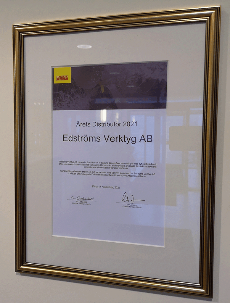 Hem » Edströms Verktyg AB utsågs till 2021 års Sandvik Coromantdistributör i Norden