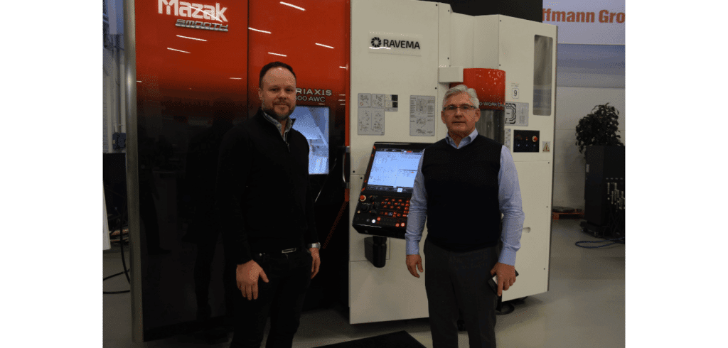 Alexander Olander (t v på bilden) och Klas Ellbin, vd respektive försäljningschef maskiner på Ravema, ses framför en Mazak Variaxis i-300 AWC. Det är en vertikal 5-axlig fleroperationsmaskin med bland annat en integrerad laddstation och ett verktygsmagasin med upp till 205 platser, magasinet kan byggas ut upp till drygt 500 platser. Variaxis i-300 AWC kan beskrivas som en kompakt automationscell.