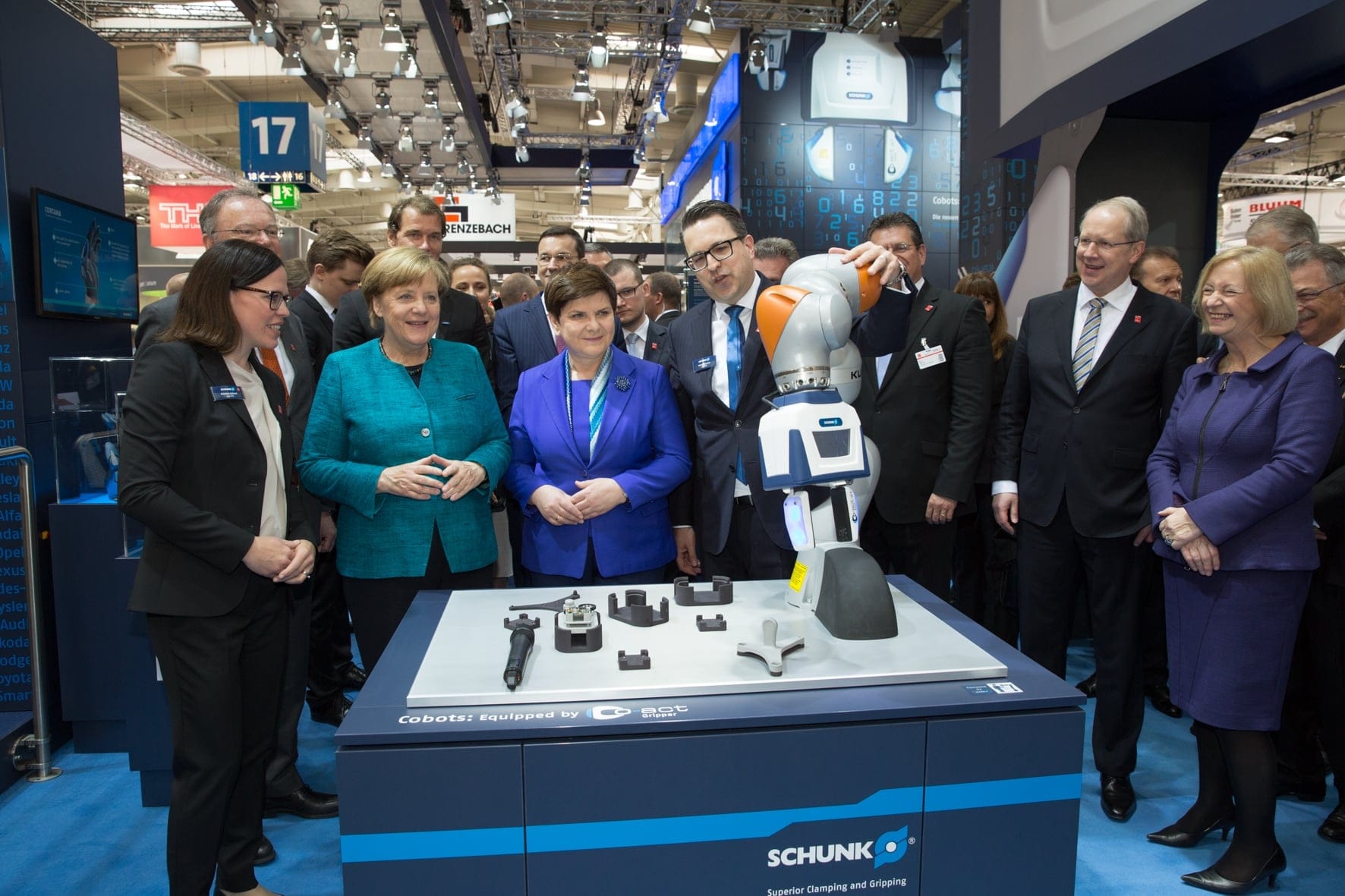 Under öppningsdagen besökte Tysklands förbundskansler Angela Merkel Hannovermässan och tittade närmare på det prisbelönta gripdonet i Schunks monter.